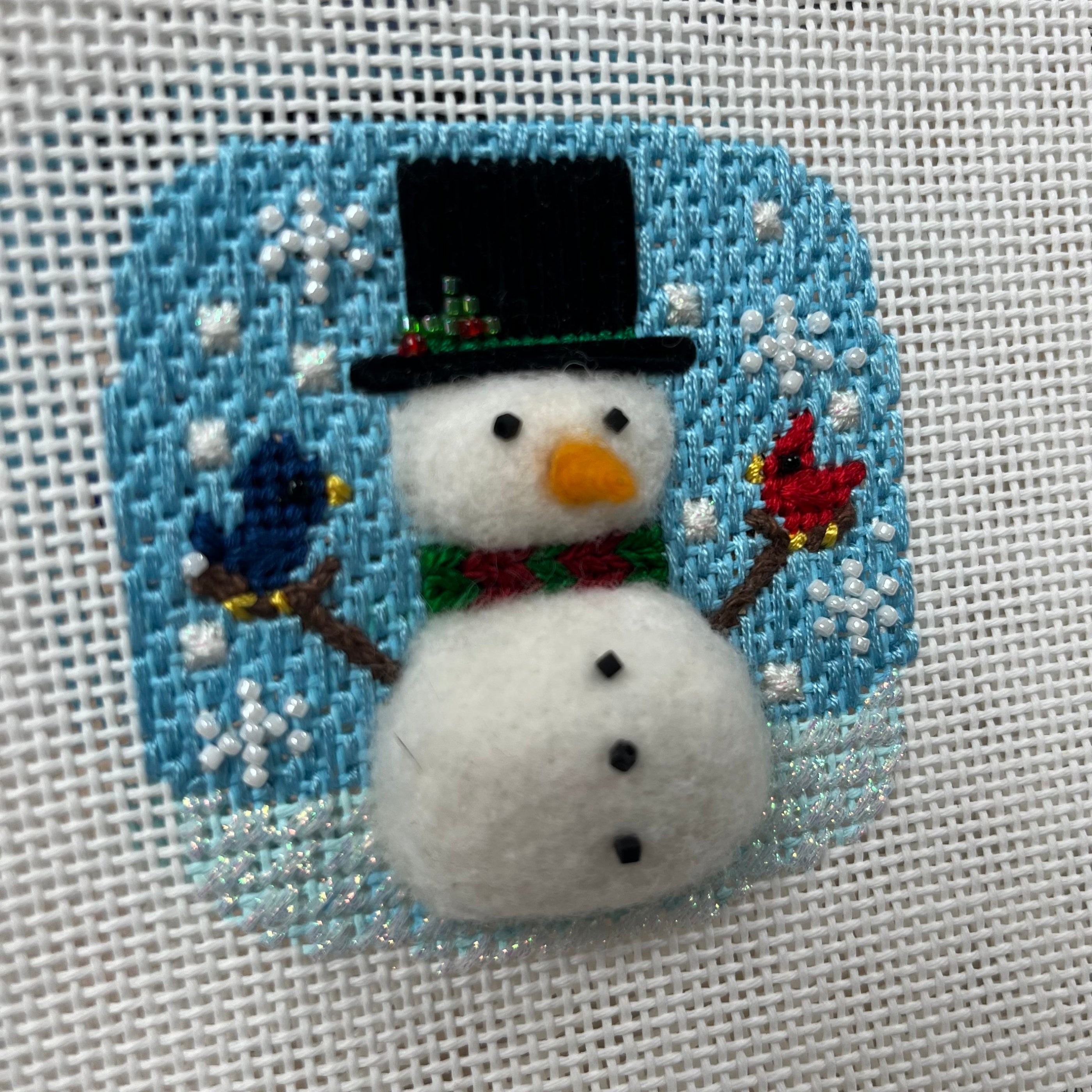 Learn to needle felt your own friendly snowman ornament. Canvas and threads/embellishments will be provided approximately one month in advance for at home stitch-prep. Class will involve needle felting instruction and implementation.