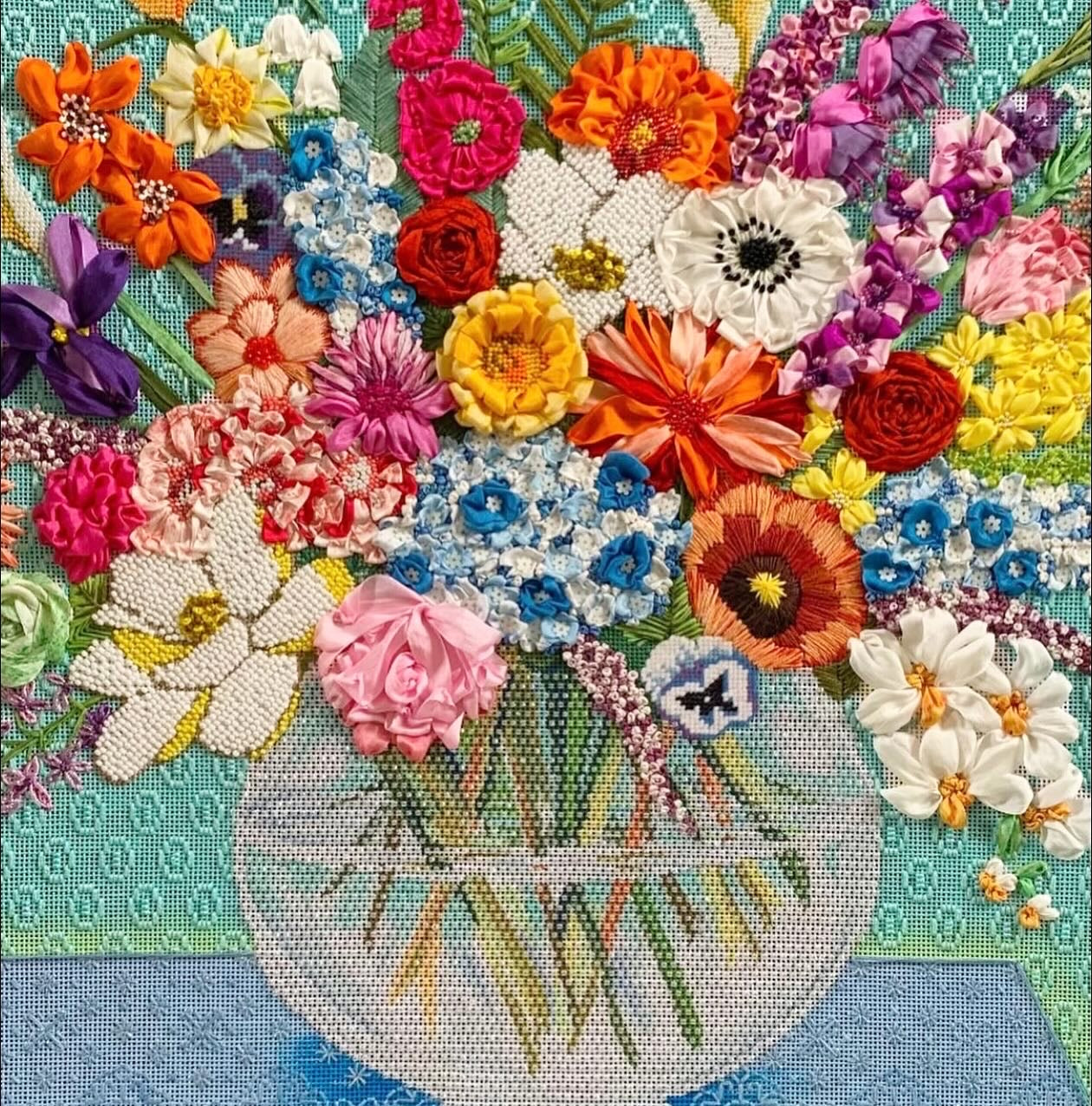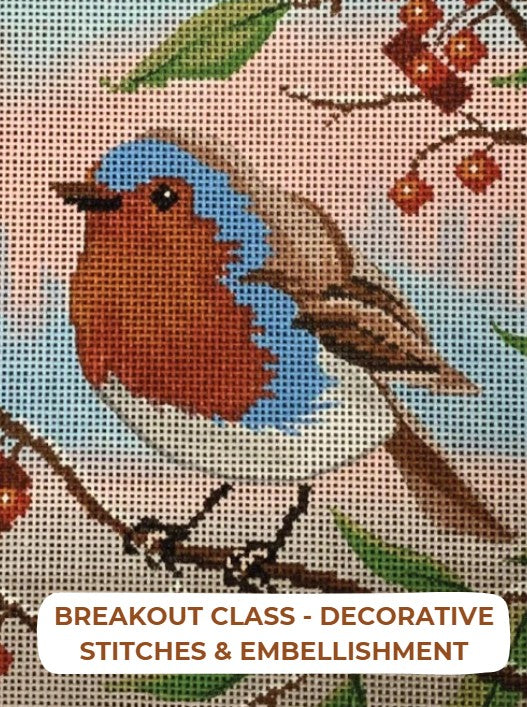 Cynthia's decorative stitch class features a beautiful Labors of Love Spring Robin, with a selection of stunning stitches and beadwork. Class will be held in separate room at Aronimink and will include the full kit, canvas & two days of instruction. Between sessions, stitchers have ability to rejoin group retreat in Ballroom. Friday/Saturday class.