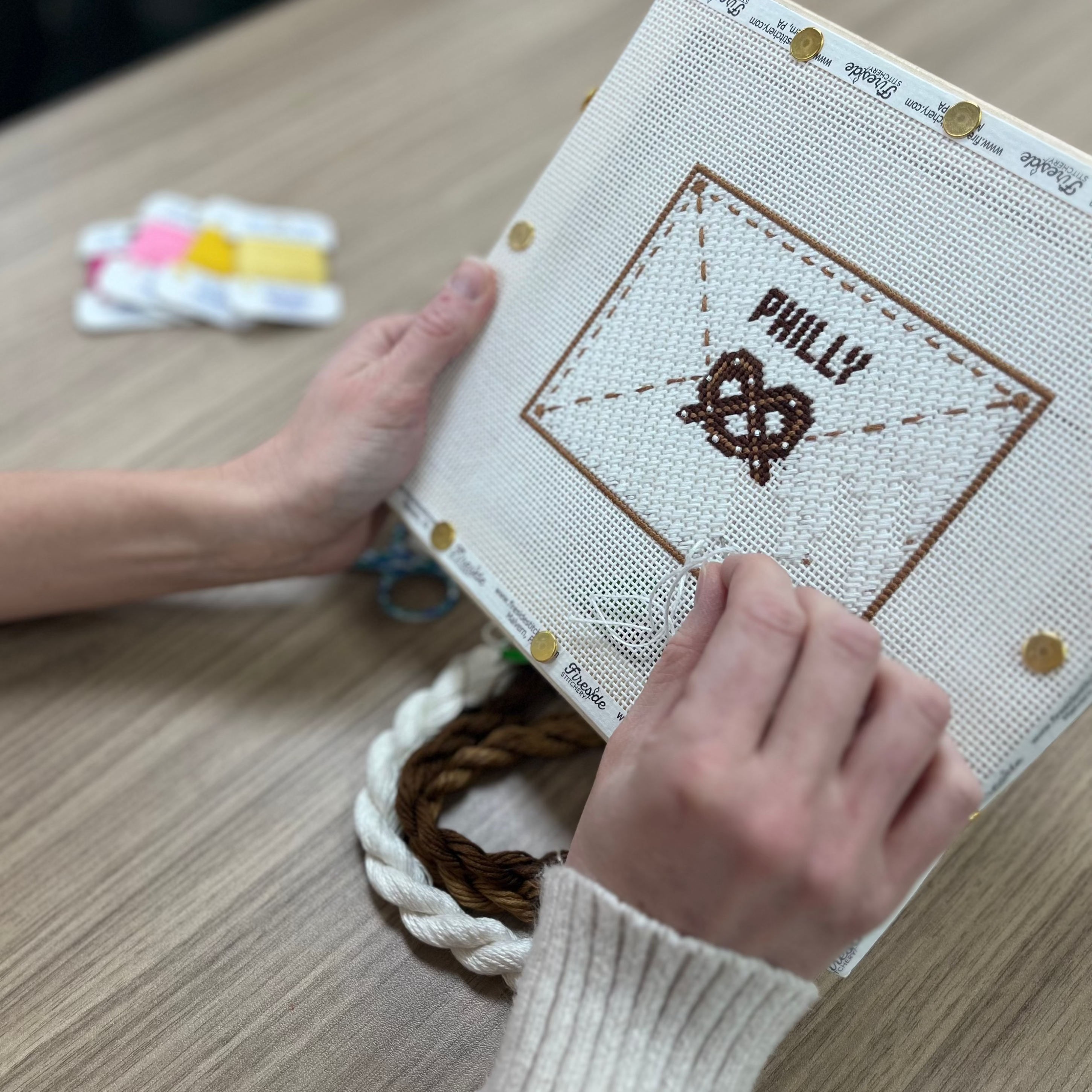 Turkey-work made EASY! Learn how to needle punch on needlepoint canvas & apply a new skill to your next pom-pom, beard, animal tail, you name it! Karen will teach you how to needle punch and which types of threads provide best look, texture, cut/uncut, and ease of application.